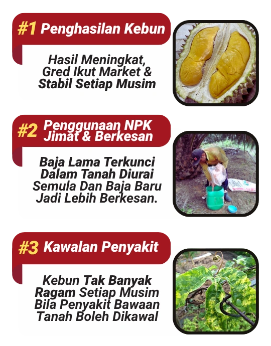 Sebab itu banyak kebun sawit, padi, durian dan sayuran melaporkan kurang masalah akar, batang & daun selepas beberapa minggu penggunaan.
